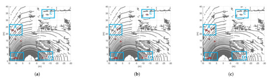 In the areas A and B where pedestrians are dense, five targets are missed by the STM-KDE. The origin point clouds of area A is given in Figure 10a, and Figure 10b shows the detection results of proposed method.