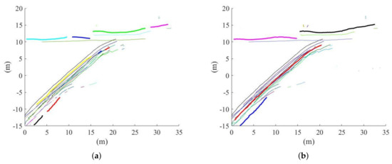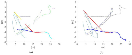 To show the tracking performance of the new trajectory management strategy clearly, the tracking trajectories of the dataset 0016 and the Beihang data are shown in Figure 11 and Figure 12, respectively. Figure 11a and Figure 12a show the trajectories with traditional strategy. Figure 11b and Figure 12b show the trajectories with new strategy. These bold curves show the difference between the tracking trajectories obtained by two different tracking strategies. The nine trajectories bolded in Figure 11a actually correspond to only four pedestrians, and the five trajectories bolded in Figure 12a actually correspond to only two pedestrians. Due to occlusion, many tracks are frequently terminated and started. Through the special processing of the occluded track, the dense pedestrians’ trajectories are more stable and continuous.