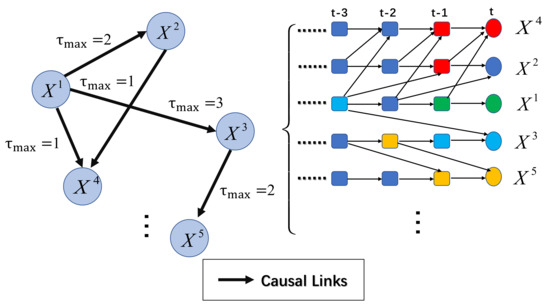 A time series causal network is a causal network that considers the causal relationship and time lag between variables. The Directed Acyclic Graph (DAG) denotes the time series causal network, and the node set denotes the set of variables. These variables are supposed to all be observable [19]. The set of directed edges denotes the causal relationship between nodes, and the causal time lag denotes the max time lags of causal relationships. Figure 2 shows an example of a time series causal network.