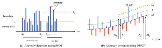 q is the risk parameter, n is the length of time series, is the number of peaks (that is, the number of ), is the updated threshold determined according to the confidence level , and Algorithm 1 shows the steps of POT.
