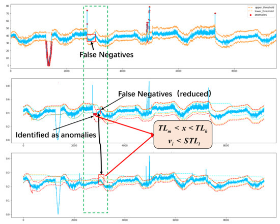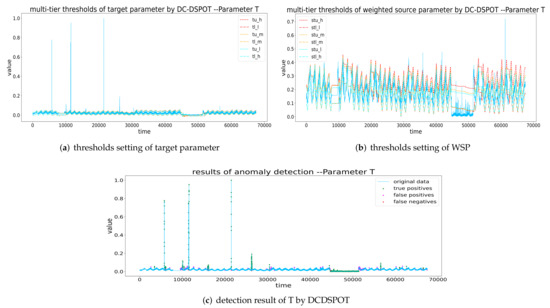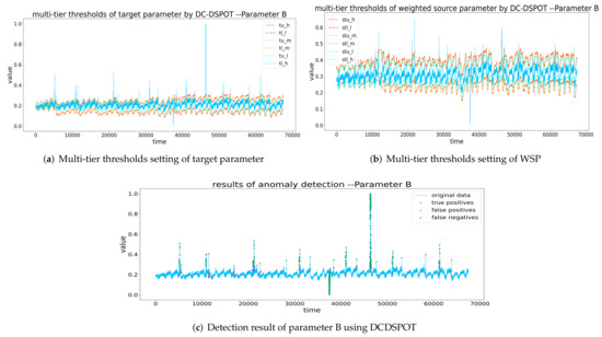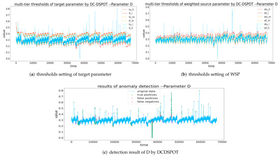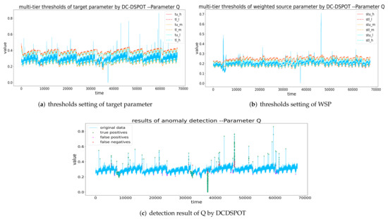 When using biSPOT, biDSPOT, and DCDSPOT for anomaly detection, the setting of the risk parameter and are very critical, because they directly affect the detection effect. In Ref. [12], q is manually set to be and , but in actual application, we need to determine the most reasonable q value based on historical detection results. In our experiment, value of q is selected by hyperparameter optimization, that is, we use grid search to find the q that can achieve the best detection performance. For different target parameter sequences, the optimal q settings are different, because these parameters have different operating modes. The parameter d of DSPOT is also determined by the same approach.