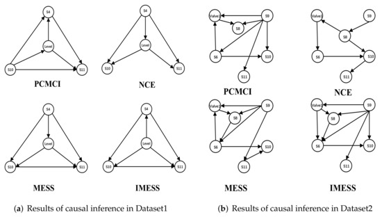 In this section, we applied MESS and IMESS for parametric causal network inference. Similarly, we employ precision, recall, and F1-score as the evaluate metrics of (see Equation (18)). Figure 11 shows the parametric causal network inferred by MESS and IMESS. Table 4 shows all the target parameters and their corresponding source parameters of all causalities. Regarding the inferred causalities, we verify the reliability by analyzing the physical properties the parameters represented and consulting experts in satellite development, design, operation, and maintenance. After comprehensive analysis, combined with the experimental results of Section 5.1, we have reason to believe that the causality inferred by IMESS is reliable and more reasonable than that of MESS (although we do not know the true mechanism of the satellite system and causality of these parameters).