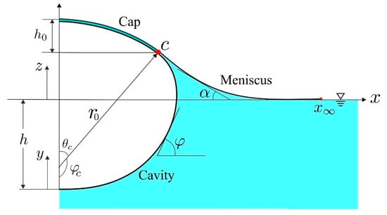 A half-section of an axisymmetric bubble floating on a liquid is presented, along with its associated parameters, in Figure 1, where is the depth of the cavity below the undisturbed liquid surface, is the point where the meniscus meets the undisturbed surface, and and are the tangent angles of the cavity and meniscus curves, respectively.