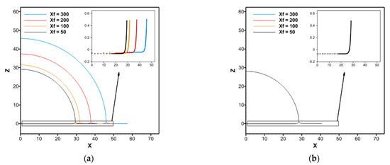 The computed bubble shapes according to the position of the boundary point for a large bubble () are presented in Figure 2. Here, the bubble shapes are seen to vary significantly depending on when the conventional technique is used (Figure 2a). When the root-finding method is used, however, the bubble shapes not affected by (Figure 2b).