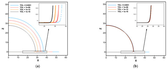 Similarly, the effect of ODE solver tolerances for the same size of bubble are presented in Figure 3. Here, the bubble shape changes slightly according to the tolerance using the improved method (Figure 3b), but the results obtained using the conventional method are unacceptable (Figure 3a). Therefore, it is essential to compute the connection point accurately for large bubbles.