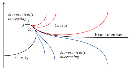 Three types of the meniscus shape according to the location of the guessed junction point. Here, is the angle at the exact junction point.