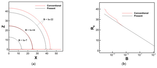 The conventional and improved methods are compared for large bubbles in Figure 5. Here, it can be seen that a smaller value of corresponds to a larger bubble size (Figure 5a). Thus, when 1 × 10−7, the bubble shapes obtained using the two different methods are almost identical. However, when 1 × 10−14, there is a slight difference between the two results, and when 1 × 10−22, the two methods show a significant discrepancy in the obtained bubble shapes. The cause of inaccuracy in the conventional method is demonstrated in Figure 5b, where the dimensionless cap radius is seen to increase abnormally as the parameter decreases in the conventional method.