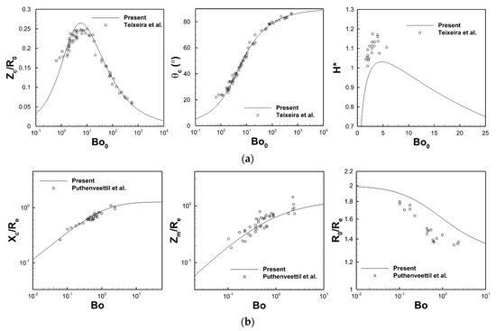 In the present study, the ODE solver employs a variable step, the 4th and 5th-order Runge–Kutta algorithm using Dormand and Prince pairs [41]. A range of the Bond numbers, i.e., , is applied to the improved numerical method. Accordingly, the results obtained using the conventional and improved methods are compared in the following subsection. Then the present results are compared with those of previous computational and experimental studies.