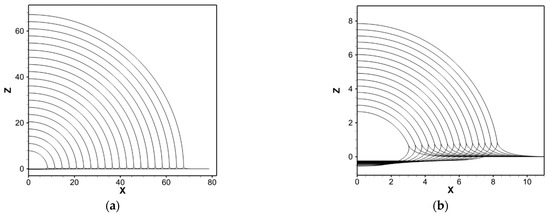 The cavity shape can be obtained by integrating Equations (8) and (9) or Equations (11) and (12) numerically. However, previous studies have shown that it is necessary to divide the cavity into two [29,32,39] or three [31] parts in order to avoid divergence of Equations (8) and (9) at . In the present study, when the cavity was divided into two parts, the numerical error was found to increase rapidly as the bubble size decreased (see Figure 6). Hence, the cavity shape was divided into the following three parts or intervals: (I) , (II) , and (III) , and Equations (8) and (9) were applied to intervals (I) and (III), while Equations (11) and (12) were applied to interval (II). However, because is not an independent variable in these equations, the numerical integrations are not completely finished at and . Hence, a conventional method is to set an arbitrary far point (or ) as a boundary condition of the ODEs and to finish the calculation when is just greater than (or ). Unfortunately, this leads to potential errors at the endpoint (or ) of the divided cavity depending on ODE solvers. The conventional method works well on medium-sized bubbles, but produces a severe error in large bubbles, especially at the position of , because the bottom of the cavity becomes substantially flat. This error is not only affected by the boundary points (or ), but also by the tolerance of the ODE solver.