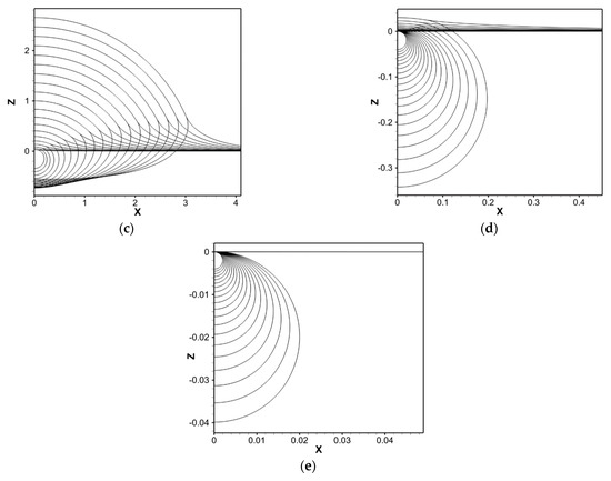 The calculated bubble shapes for are presented in Figure 9, where each shape is drawn at equal intervals on a log scale of . In the interval of to , the bubble exhibits an almost hemispherical shape, and the cavity is virtually flat (Figure 9a). However, in the interval , the shape becomes less hemispherical as the bottom of the bubble continues to descend into the liquid (Figure 9b). In the interval , the shape continues to change from hemispherical to that of a bisected rugby ball (Figure 9c). Interestingly, the depth is found to increase to a maximum value and subsequently decrease within this interval. In the interval , the bubbles have acquired a nearly spherical shape and are seen to protrude only slightly above the undisturbed liquid surface (Figure 9d). Finally, in the interval , the bubbles are almost spherical and are almost entirely submerged in the liquid (Figure 9e).