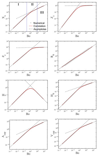 The log–log plots of the various bubble parameters with respect to the Bond number for the interval of are presented in Figure 10. Each plot can be divided into the following three regions: (I) , (II) , and (III) . The parameters for each interval are fitted with a fifth-order polynomial on the log-log scale according to Equation (28):