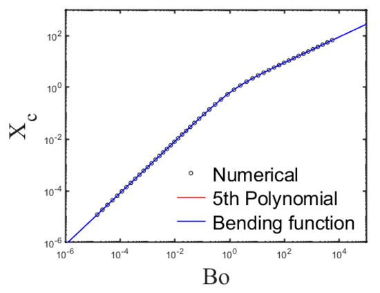 Two asymptotes appear in Figure 10 as the Bond number goes to zero or infinity. These were obtained numerically via the following simple power law: