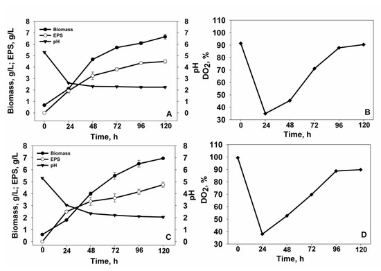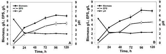 Furthermore, the yeast growth, accumulation of EPSs, and the change of pH during the fermentation process of both strains in flasks and bioreactor were monitored and assessed. The results are illustrated in Figure 1 and Figure 2, respectively. The relatively high temperature of cultivation (22 °C) was chosen to induce heat stress in the psychrophilic yeast cultures, aiming for an extensive accumulation of EPSs as a protective response mechanism. The kinetic of the fermentation process of V. victoriae showed preservation of the standard course of the exponential curve and entering the stationary phase after 72 h (Figure 1A). The amount of accumulated biomass at the 120th h of cultivation was about 6 g/L. At this stage, a carbon source was utilized, and EPS was formed. The quantity of accumulated EPS was over 4 g/L. Considering Tremellomycetes sp., a similar trend was observed, as the synthesized biopolymer at the end of the fermentation was 4.5 g/L. The accumulated biomass was about 7 g/L at the 96th h; after that, it entered the stationary phase of growth (Figure 1B). Interestingly, we found a considerable decrease in pH from the initial 5.3 to 2 for both producers during the first 24 h of cultivation.