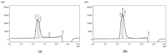 Considering the T-EPS elution profile, there was no significant difference in the range of high molecular weight of V-EPS and T-EPS, which was illustrated as a similarity in elution pattern. This suggested the similarity in the structure and molecular weight. Three high molecular weight populations were recognized and eluted early before 7.0 min at 5.9, 6.0, and 6.2 min. Different peaks represented 27%, 26%, and 43% of the total peak area and cover the range between 68 × 104 g/mol and 51 × 104 g/mol. An additional small peak (<10,000 g/mol) was eluted later after the main peaks at RT 11.0 min, and it occupied only 4% of the total peak area.