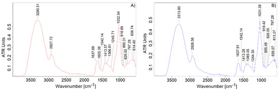 The FT-IR spectrum of V-EPS and T-EPS are presented in Figure 4. Both spectra were typical for polysaccharides with the characteristic signals at 3290.51 (3313.80) and 2927.72 (2926.56) cm−1, arising from ν(OH) and ν(CH and CH2) vibrations, respectively [34].