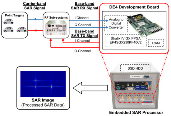 As described in Section 2.2, an SAR image-formation algorithm is a computationally intensive task that involves several complex operations and algorithms. FFT and IFFT play an important role in SAR processing, which motivates extensive study of FFT/IFFT algorithms for hardware implementation. FFT and IFFT coprocessors have been successfully developed and will be deployed in the implementation and integration of FPGA-based SAR processors [33]. The overall development of the SAR processor was based on hardware blocks described in Section 2.1. The submodules of the FFT coprocessor, IFFT coprocessor, complex multiplier and ROMs were integrated and used to implement the RDA into the Altera Stratix IV GX FPGA EP4SGX230KF40C2 device, which is located on the Altera DE4 development board. The overall block diagram for the hardware implementation of the FPGA-based SAR processor is illustrated in Figure 3.