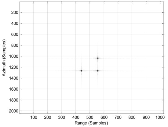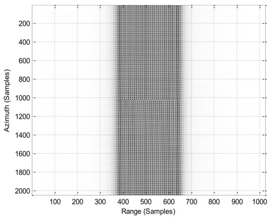 After the data were transformed into the range-Doppler domain, they were then passed through the azimuth compression, which consist of the azimuth-matched filtering process. The data were multiplied with the precomputed azimuth reference function using the designed complex multiplier. The output of the matched filter is transformed into time domain and the data appear as azimuth-compressed data. The final output of the SAR processor is the azimuth compressed data, which is the single-look complex SAR image. Figure 14 shows the azimuth-compressed data processed by MATLAB, while Figure 15 shows the azimuth-compressed data processed by the proposed SAR processor.
