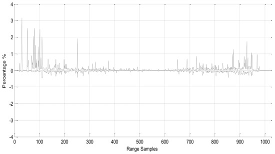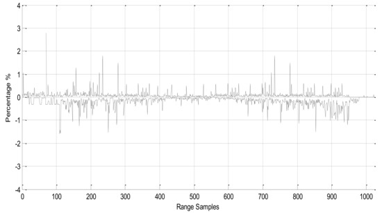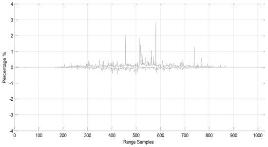 After evaluating the intermediate results for range compression, evaluation was carried out by observing the intermediate results for azimuth compression. The evaluation was conducted in the same manner as for range compression. The range-compressed data are transformed into the range-Doppler domain by MATLAB and the proposed SAR processor. Figure 11 shows the magnitude plot of the range-compressed data that are transformed into the range-Doppler domain by using MATLAB. Figure 12 shows the range-compressed data being transformed into the same domain by the proposed SAR processor. From both figures, recognisable patterns with high similarities can be observed in between both results. In order to obtain a quantitative comparison, the differences between the results were computed in the same manner. The range-profile difference error is illustrated in Figure 13. Figure 13 shows that the differences are in the acceptable tolerance, as there are only a few portions of range samples with an error in the range of ±1.5%.