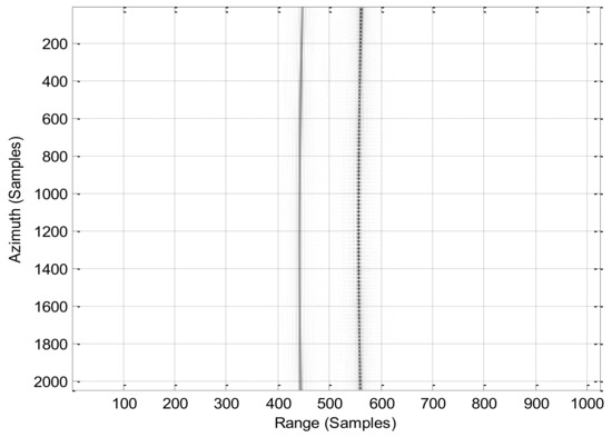 Range-compressed data in the range-Doppler domain by MATLAB 2048-FFT.