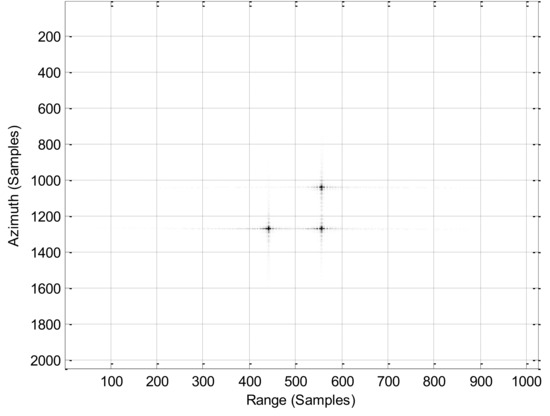 The time taken for a single 4096 FFT/IFFT was 168.59 μs. The time taken for complex multiplication in matched filtering for one range line of 4096 samples is 12.04 μs (one clock cycle, 2.94 ns × 4096 samples). The whole operation was repeated 2048 times in order to complete the range compression of the SAR raw data. Thus, the time taken to complete 4096 points FFT and IFFT for 2048 azimuth samples was 345.27 ms for each operation, while the complex multiplication took 24.66 ms. The processing time spent for such SAR raw data samples sizes are tabulated under the range-compression column in Table 2. Meanwhile, the azimuth compression was repeated in the same manner, except a 2048-FFT coprocessor was used, as there was a total of 2048 azimuth lines. The time taken for a single 2048 FFT/IFFT was 78.27 μs. Hence, the time taken to complete 2048-point FFT and IFFT for 4096 range samples was 320.6 ms for each operation, while the complex multiplication was the same, at 24.66 ms. The processing time spent for the azimuth compression is tabulated under the azimuth column of Table 2. The total summation of the time is 474.31 ms, which represents the total time required by the proposed SAR processor in order to process an SAR image.
