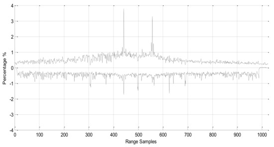 Since SAR image is formed by multiple range lines, the most positive and the most negative differences throughout all the range lines were calculated. Figure 7 illustrates these differences in the SAR raw data range profile in the frequency domain. The figure shows that the majority of differences in the results are in the range of ±0.5%, with a maximum error of no more than 3%. This error is mainly due to the quantisation error from the ADC. From the difference error, it can be concluded that the range profile is around 1% of the quantisation noise floor. This noise floor exists in the raw data even when there is no point target.