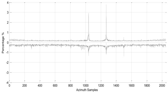 Figure 16 and Figure 17 show that the majority of differences are in the range of ±1%. This error is mainly due to the quantisation error from the system. It can also be concluded that both profiles consist of a quantisation noise floor around ±0.5%, even when there is no point target in the data. Another observation from the difference is that when there is a point target in the image for a particular range and azimuth samples, the difference error also increases. The sample points with the reflected point targets have a slightly higher difference error of about 3.5% as compared to the background. This is mainly due to the low dynamic range of the fixed-point data formatting used in the proposed processor.