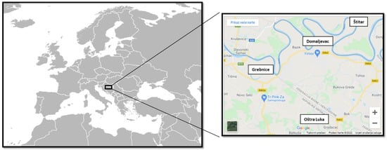 Six subfossil oak trunks (samples 1–5) were retrieved from the Sava riverbed between the villages of Grebnice (45.046648, 18.528779) and Domaljevac (45.074475, 18.588781) in Bosnia and Herzegovina (Figure 1). The trunks were found under a 1–2 m layer of gravel in the central part of the riverbed where the depth of the river is never less than 5–6 m. The oldest subfossil oak trunk (sample 6) originated from a gravel pit in the village of Oštra Luka (45.001281, 18.568225). That gravel pit developed following the gravel exploitation within the area of the Sava River branch. The trunk was taken from a depth of 8 to 9 m under the water level of the lake, below a thin layer of sand and silt.
