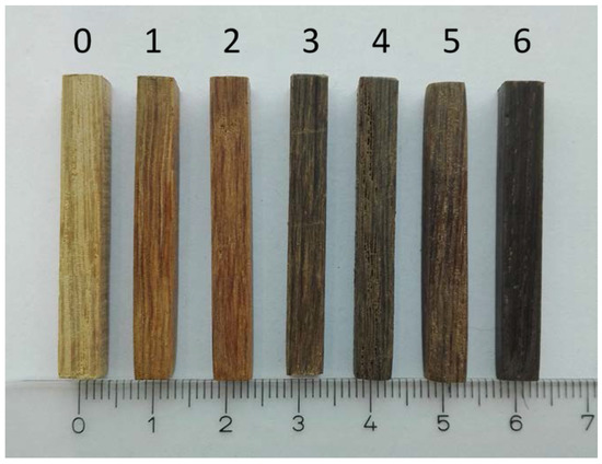 The wood specimens intended for microstructural determination analyses were prepared as thin cross sections with a microtome and were examined under an OLYMPUS BX 51-P transmittance light microscope for the purpose of wood taxa identification. The wood anatomy atlas [29] was used for the identification of the examined samples. The test pieces intended for the determination of abrasion wear resistance were cut from the heartwood, their dimensions being 5 mm × 5 mm × 40 mm (Figure 2). All pieces were acclimatized for a few weeks at room temperature. Wood specimens showing cracks or some other defects were rejected and not used in the test. Ten wood specimens were examined for each sample (0–6). The length of all test pieces (40 mm) coincided with the natural axes of fiber orientation (longitudinal direction), and the friction surface (5 mm × 5 mm) coincided with the cross section of the wood. We selected the test specimens from oak trunks with an as similar as possible growth ring width (1.3–1.9 mm),to avoid the influence of the percentage of late and early wood on abrasion wear resistance [30]. The samples of subfossil oak were much darker than the sample of recent oak (Figure 2), owing to the reaction between the iron from the riverbed soil and the tannins in the oak wood [7].