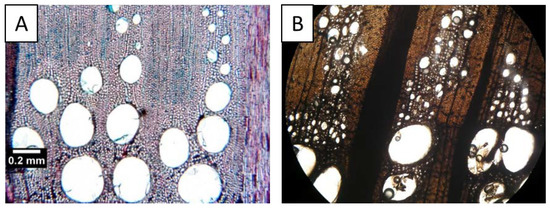 Microstructure of (A) recent normal wood and (B) subfossil (sample 6) oak wood.