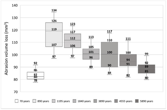 The mean values of volume loss of the samples ranged from 83.5 to 116.9 mm3. The normal wood sample (0) showed the lowest value of volume loss. All subfossil oak samples (1–6) showed a higher value of volume loss and lower abrasive wear resistance compared to the recent oak (0) (Figure 5). If only the subfossil oak samples were taken into consideration, linear regression analyses of the test results indicated that there was a strong negative linear relationship between abrasive volume loss and age (Figure 6). The correlation coefficient for this relationship was −0.927 (R2 = 0.859). This decrease of abrasive volume loss could be unexpected, because of the presumption that with age, abrasion resistance will continue decreasing. Although the degradation of wood progresses with time, simultaneously, the process of fossilization occurs, and the content of iron, calcium, ash, and extractives in oak wood increases [7,21,22]. The process of fossilization is the most probable microstructural reason for abrasion wear resistance growth. Although there is a strong negative linear relationship between abrasive volume loss and age, we must be aware that some previous investigations showed that for subfossil samples, the time factor was of minor importance, while the environment played the main role in the process of destruction and fossilization of wood as well as in the changing of its mechanical and physical properties. An example is reported in the study of Kolar and Rybníček [20] of the physical and mechanical properties of sub-fossil oak and their comparison with those of recent wood. The research showed an unambiguous difference between a recent sample and all subfossil samples, but the properties of subfossil samples were not clearly dependent on the age of the samples. Five of the subfossil samples investigated in this study originated from a very short section of the river Sava (Figure 1); therefore, in this study, the quality of water and the geological background of the test specimens were almost the same, which certainly influenced by such a strong relationship between age and abrasion wear resistance.