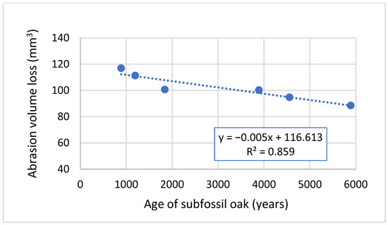 Linear regression analyses showed a strong negative linear correlation, with correlation coefficient R = −0.948 (R2 = 0.900), between abrasion volume loss and wood density at 12% MC (Figure 8). The oldest subfossil sample and the normal wood sample (0) showed the highest density values and the lowest volume loss in the abrasion test. Although the subfossil sample had a slightly higher density than the recent oak sample, its volume loss was higher. This conforms to the results obtained in the study of Mankowsky et al. [37], where it was shown that with, the same density values, the normal wood (recent) sample had better mechanical properties than the subfossil sample.