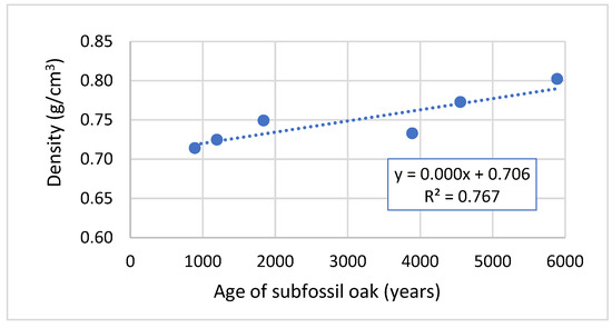 There was a strong positive linear correlation between the subfossil oak wood density and its age. The subfossil samples aged up to 3890 years showed a similar density that was much lower than the density of the recent oak. A further increase in age led to a significant increase in the density of subfossil wood.