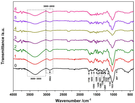 The chemical composition of the representative control specimen (0) and specimens 1–6 was analyzed by infrared spectroscopy. We recorded the FTIR spectra of the representative control specimen (0) and specimens 1–6, and all the detected bands are presented in Figure 9. The results for the tested samples (1–6) were compared to the spectra of the representative control specimen (0). The main bands associated with cellulose and hemicelluloses were identified at 3650–3000, 2903, 1736, 1458, 1423 1368, 1319, 1156, 1103, 1031, and 897 cm−1, while lignin was identified by the bands at 1595, 1509, 1265, and 1232 cm−1 [20,27,38,39,40].