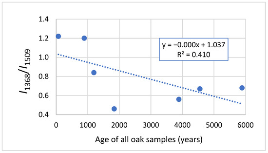 The I1368/I1509 ratio decreased during wood ageing compared to the control sample (0) (Table 2). This suggests that the degradation of lignin in subfossil oak samples progressed more slowly over time than cellulose degradation. A linear correlation between the I1368/I1509 ratio and wood age gave only a moderate correlation coefficient R = −0.640 (R2 = 0.410), Figure 10.