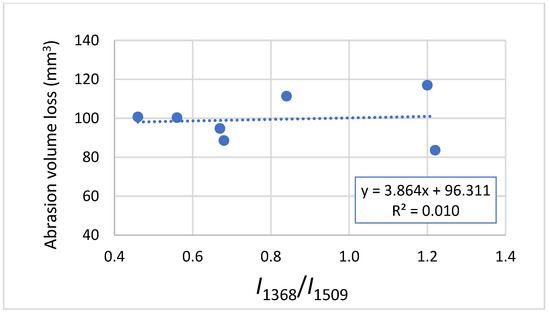 As the samples were not exposed over time to the same environmental conditions, such as the presence of oxygen that influences lignin degradation, there appeared a big difference regarding lignin degradation in samples 1–6, as expected. The I1368/I1509 ratio had no influence on the loss of volume during abrasion (Figure 11).
