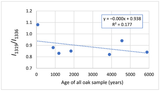 Correlation between the I1319/I1336 ratio and the age of oak wood samples (0–6).