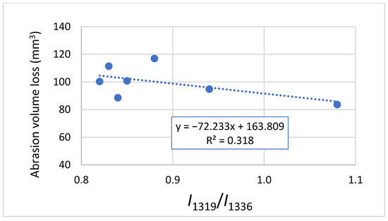 Correlation between abrasion volume loss and the I1319/I1336 ratio for samples 0–6.