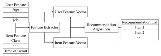 The content-based recommendation method creates a user preference file from the user’s rating, viewing, and labeling behavior so that it can recommend the contents most aligned with that preference. In their pioneering paper, Basu et al. developed a recommending algorithm capable of incorporating both user ratings and item knowledge [13]. Then, Bhagavatula et al. developed the content-based academic paper recommending system [14], Pablo et al. developed an artwork recommendation based on content [15], and Sun et al. developed a customized service recommendation system based on content [16]. An algorithm based on content is obviously better for those with professional knowledge in that field. However, content-based recommendations face the issue of cold starts and overfitting.