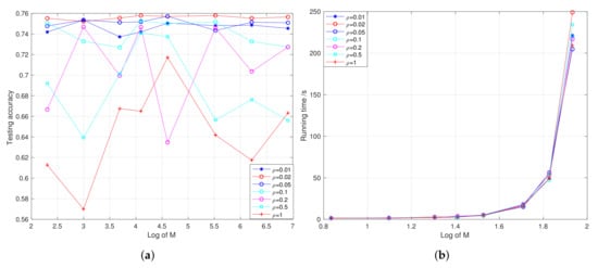 Testing accuracy and running time under different M. (a) testing accuracy under different M; (b) running time under different M.