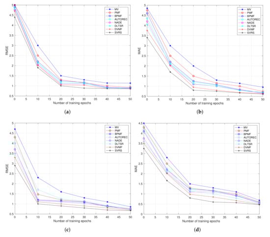 Figure 4a shows the results using datasets MovieLens-100K and MovieLens-1M in terms of RMSE. It is easy to see that SVRS improves by 0.19% compared with the DVMF. Note that DLTSR reaches the same result as SVRS because it adapts to different training data and is computationally efficient. In summary, SVRS performs better than other algorithms.