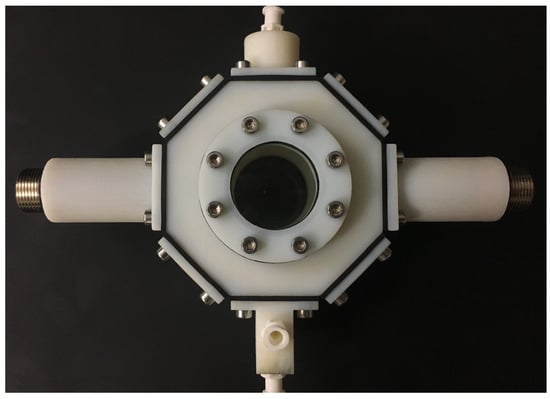 The Microbubble Acoustic Characterisation Chamber (MACC) was designed for acoustic measurements of populations of microbubbles. An image of the MACC, manufactured using an Objet1000 Multi-Material PolyJet 3D Printer (Stratasys, Minneapolis, MN, USA) in Vero™ material, is shown in Figure 1. The MACC consists of a central chamber that can accommodate up to six single-element transducer housings, an inlet housing, and outlet housing.