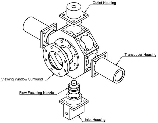 The MACC chamber is an extruded octagon design, and 8 of the chamber’s faces feature a 22 mm-diameter channel. Transducer housings, the inlet housing and the outlet housing can be inserted into these channels. The other 2 faces feature 28 mm-diameter channels to accommodate inspection window housings. The total dimensions of the central chamber are 70 × 70 × 28 mm. The dimensions of the chamber represent a trade-off between limiting the internal volume, keeping the transducers operating in the far-field and reducing reverberations inside the chamber. Inspection windows allow a limited view inside the chamber and consist of 32 mm-diameter, 3 mm-thick, and clear acrylic disks situated in the inspection window housings. The central chamber features a series of 4 mm holes that are populated with M3-threaded inserts. All housings are secured using M3 socket screws and 1.5 mm-thick neoprene gaskets. The design files for the chamber, various housings, and neoprene gaskets are included in the repository. The list of parts and the assembly guide for the MACC can be found in the knowledge base (https://github.com/UARPGitHub/MACC/wiki/AssemblyGuide). The chamber was designed using Autodesk® Fusion 360. An exploded view of the MACC is shown in Figure 2.