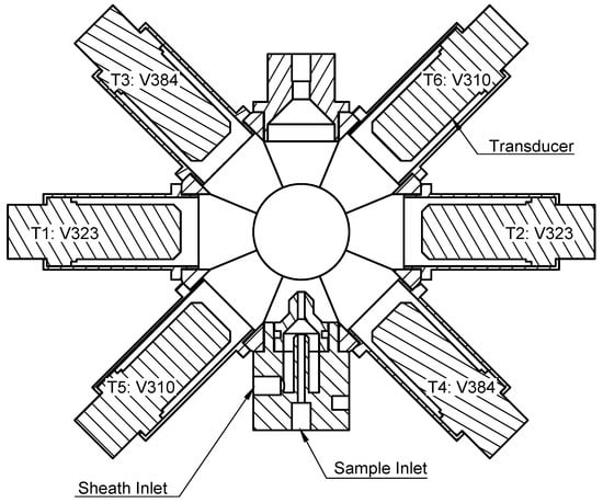 The chamber was populated with all six transducers, and the pairs of transducers corresponding to the same central frequency were placed in line with each other according to Figure 4. The chamber was filled with deionised water. Due to the geometry of the chamber, it is possible for air to accumulate and become trapped within the upper two transducer housings. To prevent this from happening, the outlet stopcock was closed, and the upper transducer connectors were loosened during the initial filling stage to allow air to escape through the top of the upper transducer housings. The connectors were then tightened once more, and the outlet stopcock was opened for experimental measurements. A total of 110 mL of water was required to fill the chamber. Flow rates were assessed before the experiment when characterising the chamber. During this assessment, dye was applied to the sample to visualise the flow-focusing behaviour. A sheath flow rate of 22 mL per minute and a sample flow rate of 7 mL per minute were determined to provide a stable sample stream. This resulted in the sample being constrained to a stream approximately 1 mm in diameter in the centre of the chamber. It is worth noting that this process should be repeated for individually manufactured inlet housings to account for manufacturing discrepancies.
