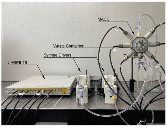 The MACC design has been used to measure the acoustic scattering at the fundamental frequency and second harmonic of SonoVue®microbubbles. The experiment was performed with a 16-channel variant of the Ultrasound Array Research Platform (UARPII-16) developed at the University of Leeds and shown in Figure 5. This open platform allows the connection of 16 single-element transducers and can transmit and receive on all 16 channels simultaneously. The MACC, UARPII-16, and all six unfocused transducers were used to perform an experiment to assess the suitability of the entire setup for microbubble acoustic measurements [33]. Whilst the UARPII-16 was used in this instance, it could have been replaced with another multi-channel system providing access to the radio-frequency data from every channel [34] such as the NDT Vantage™ (Verasonics®, Kirkland, WA, USA) research solutions. Alternatively, a setup consisting of an arbitrary waveform generator, power amplifier, and oscilloscope [7,27,29] could be used, provided this setup accommodates six channels.