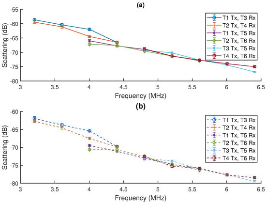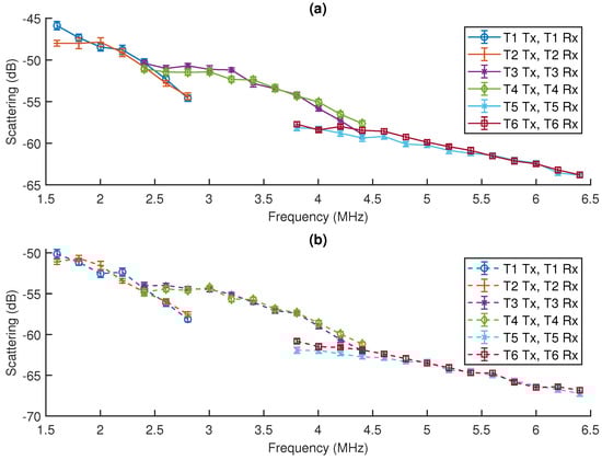 Figure 6 shows the fundamental backscatter calculated over the frequency range of 1.6–6.4 MHz using Equation (1). The mean backscatter values from Figure 6a are included in Appendix Table A1 and for Figure 6b in Appendix Table A2. From Figure 6, it can be seen that the scattering from SonoVue® is highest at the lowest frequencies investigated. This is in general agreement with previous studies [31]. As is expected, because the measured scattering is the summation of the scattering from individual microbubbles, the lower dilution sample resulted in a lower scattering value. Both dilutions show the same general trend with frequency, and this gives confidence that the chamber is suitable for the measurement of dilutions of SonoVue® in the range of clinical doses. The measurements from the various transducers also overlap and are in general agreement with regards to the overall trend. For the pairs of transducers that are used to investigate the same frequency range, the scattering measurements are in agreement. This is further validation that the measurements are reliable. There is some discrepancy between the scattering values at the frequencies that overlap between different transducer pairs. This is likely due to mismatches in the transducer sensitivity compounded by the limits of the usable bandwidth for a transducer. This highlights the importance of performing the experiment within reasonable frequency limits for a given transducer and in the robust calibration of transducer receive-sensitivity.