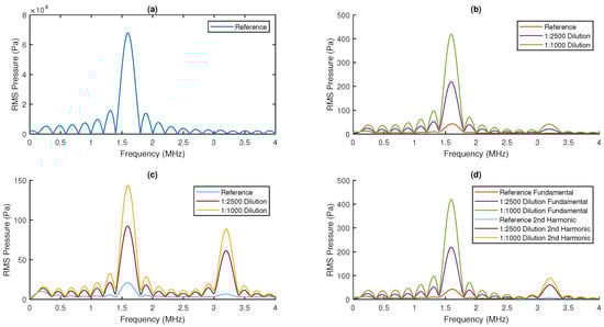 Root mean square (RMS) pressure spectra for 1.6 MHz insonification using T1 and received on (a) T2, (b) T1, and (c) T3 as illustrated in Figure 4. (d) Combined RMS pressure spectrum with T1 used to measure scattering at the fundamental frequency and T3 used to measure scattering at the second harmonic.