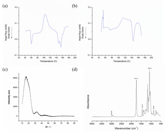 Characterization of unirradiated PLA. (a) Average DSC cycle 1; (b) average cycle 2; (c) XRD diffractogram; (d) FTIR spectra (labels: 2994.96, 1746.74, 1451.68, 1080.44, 866.86 cm−1).