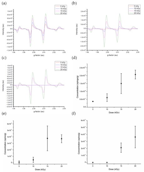 (a–c) Time series of EPR spectra for PLA irradiated at 4 different doses: 5 kGy (red), 10 kGy (blue), 15 kGy (pink), and 20 kGy (green). There were three time points used: (a) same day as irradiation (day 0); (b) day following irradiation (day 1); (c) second day following irradiation (day 2). (d–f) Dose–yield plots over the first three days. These measurements were taken twice at 5 kGy, twice at 10 kGy, four times at 15 kGy, and twice at 20 kGy. (d) Day 0; (e) day 1; (f) day 2.