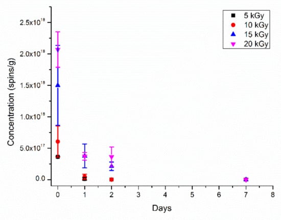 Time dependence radical concentration decay for PLA samples after irradiation at 5 kGy, 10 kGy, 15 kGy, and 20 kGy. The values at day 0 on the x-axis correspond to spectra that were taken a couple of hours after irradiation and kept in dry ice.