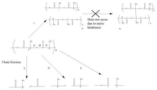 Figure 4 shows the overall proposed reaction mechanisms of the radiolysis of PLA in the absence of oxygen. The EPR results demonstrate the radiation-induced C-O-C bond scissions that lead to the formation of the oxidative alkoxyl radicals and the reductive C-centered radicals. The alkoxyl radicals abstract H atoms from the neighboring molecule, giving rise to the formation of more C-centered radicals. The carbon-centered radicals on nearby PLA chains are not expected to undergo crosslinking reactions (reaction pathway i) because of steric hindrance. After chain scission (reaction pathways ii and iii), the alkoxyl radical abstracts a hydrogen from an adjacent polymer chain, giving rise to the formation of C-centered radicals. In addition, alkoxyl radicals undergo β-fragmentation and 1,2-H-shift reactions []. Since oxygen is not present during the EPR measurements only, the peroxyl radicals are not expected to be present, thus limiting the potential for chain scission []. In this investigation, dry ice was used to slow radical concentration decay kinetics until they could be characterized by EPR, and the inert atmosphere was used to prevent the formation of undesired radical species, such as the peroxyl radical, that could impact the resultant PLA structure. As expected, the presence of the L and D stereoregular forms of PLA shown in Figure 5 did not impact the shape of the EPR spectra.